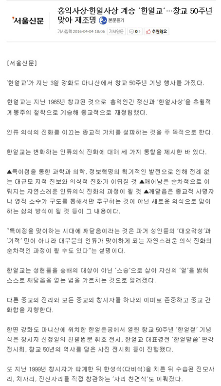 [서울신문] 한얼교 창교 50년 기념 '한얼절' 행사